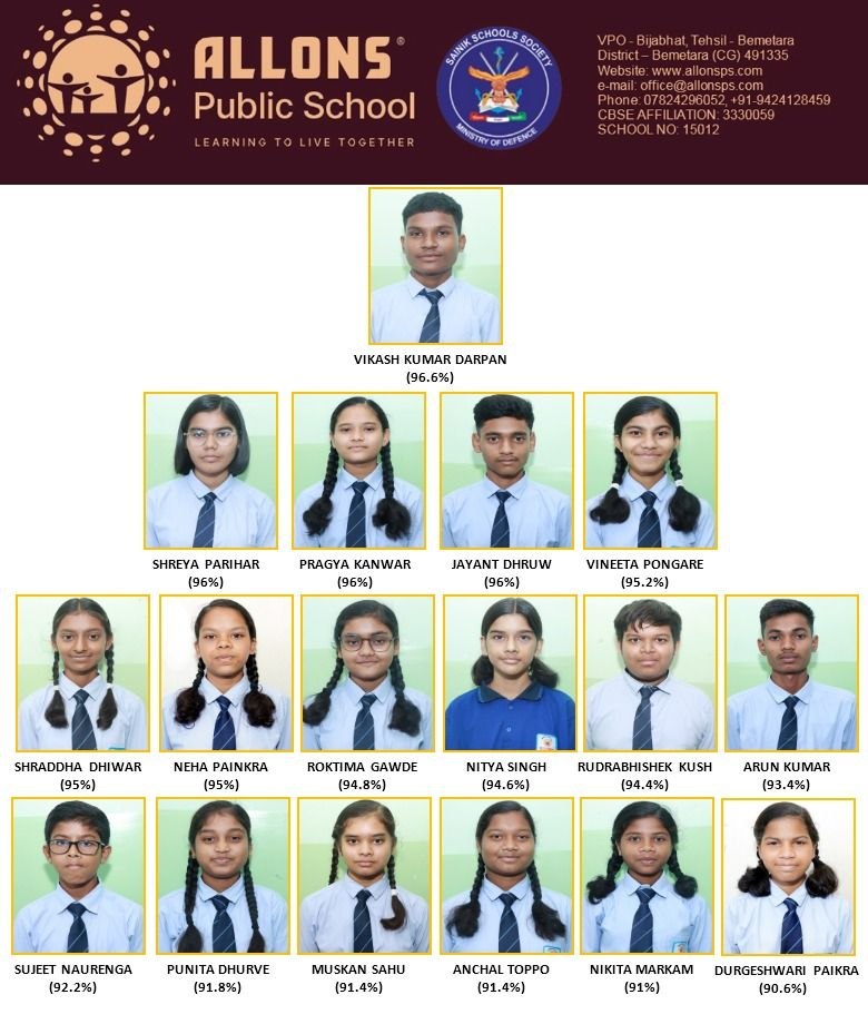Other commendable performers include Arun Kumar (93.5%), Sujit Naurenga (92.2%), Punita Dhruve (91.8%), Muskan Sahu (91.4%), Anchal Toppo (91.4%), Nikita Markam (91%), and Durgeshwari Painkra (90.6%), all of whom have contributed to the school’s excellent overall result.